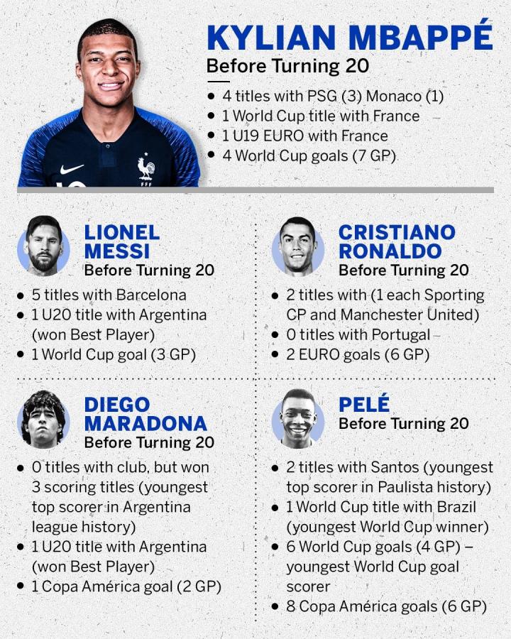 成名以来,姆巴佩一直被视为梅罗之后竞争世界第三人的有力人选,ESPN将法国天才与C罗、梅西、马拉多纳和贝利这四大巨星同期的数据做了一番比较。