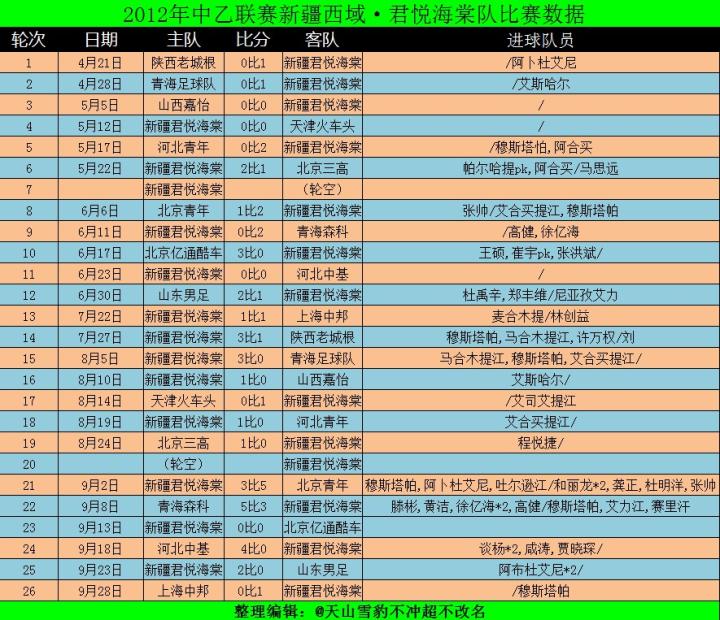 2012年中乙联赛新疆君悦海棠队比赛数据