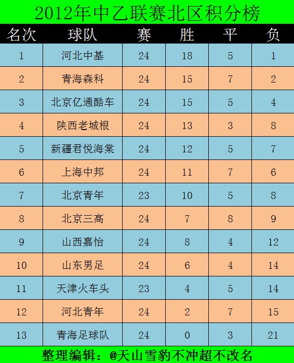 2012年中乙联赛最终积分榜,新疆海棠排名第五无缘决赛阶段
