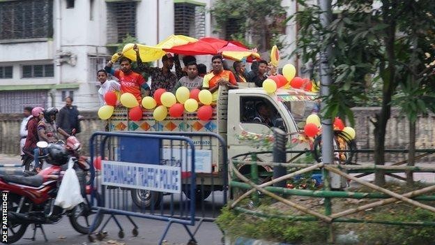 东孟加拉的极端球迷刚刚完成了他们的“列队仪式”:在烟雾和鼓声下,几百名球迷沿着主干道往前走。附近的街道已经封路,车辆无法通行,而住户们也来到主路两旁,欣赏球迷们的“表演”……许多辆平板卡车和吉普车驶往球场,站在车上的球迷们挥舞着旗帜,对着扬声器高呼口号。