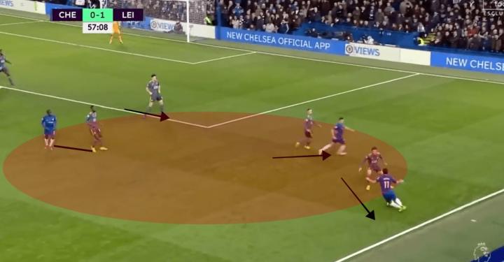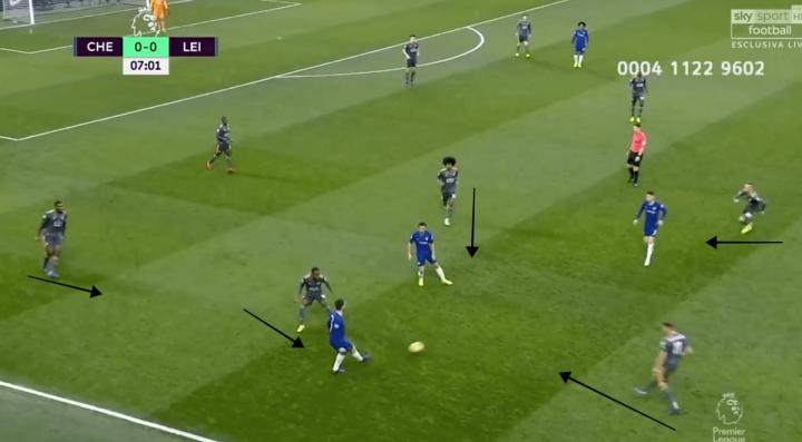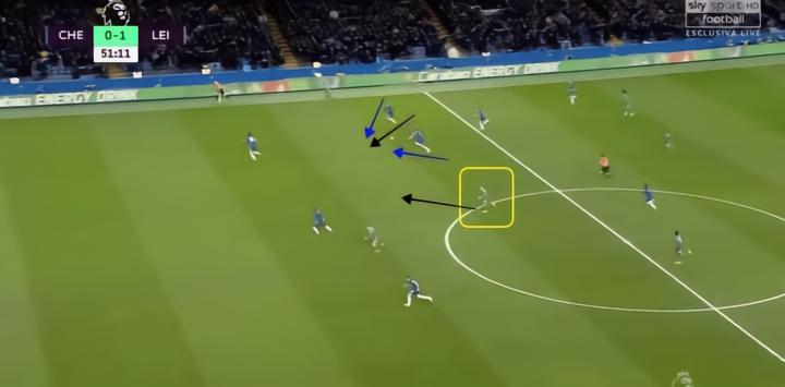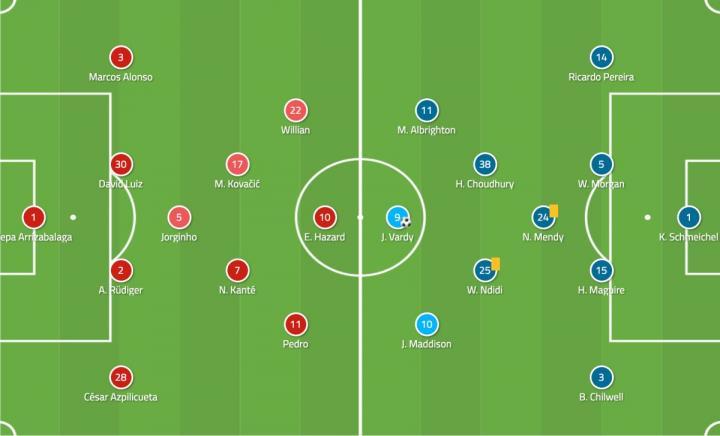 在萨里的执教下,切尔西有实力通过快速的垂直传球从后场组织起来,但是莱斯特城打乱了切尔西的节奏。他们保持高位并缩小空间是至关重要的,这使得莱斯特城能够在切尔西半场夺回球权。