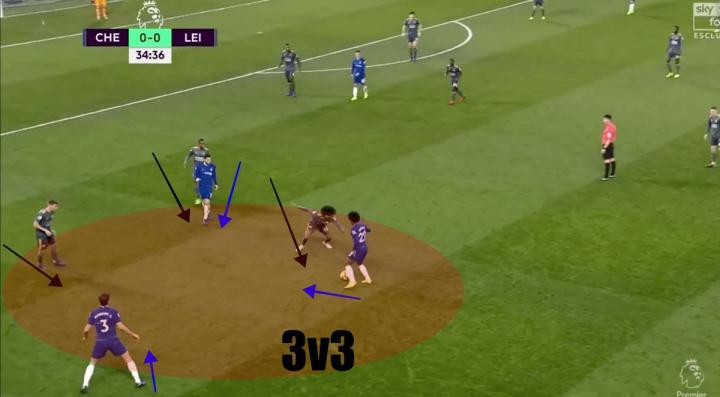 请注意下图,在边路3V3的情况,切尔西并不能在边路形成人数优势。