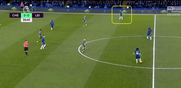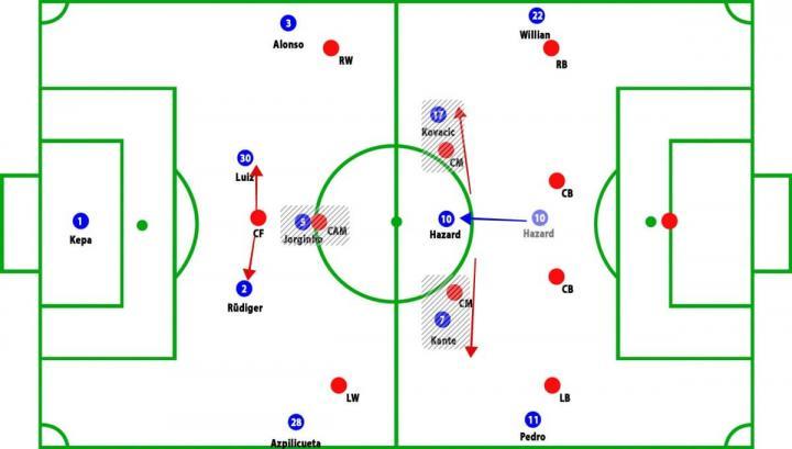 在组织初期,坎特和科瓦契奇非但没有停留在较深的位置协助组织,反而会来到第二条线上占据有利的进攻位置,拉扯对手中场线,以此在中场打开一个缺口,这时阿扎尔就可以回撤到中场这个开放的空间接球再进攻。