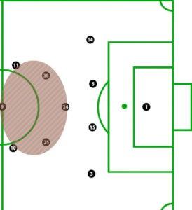 由于边锋和边后卫经常占据相同的垂直区域,所以当球来到边路时,没有足够的传球选择,边后卫传给边锋的传球线路很容易被封死,所以边后卫只能将球回传中后卫,边路进攻也非常不顺畅。