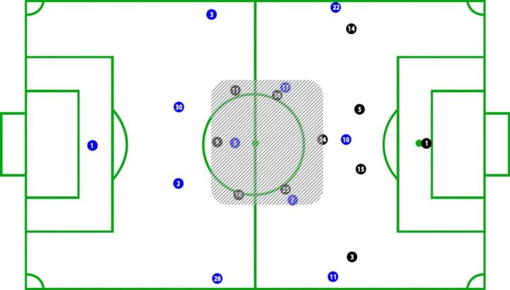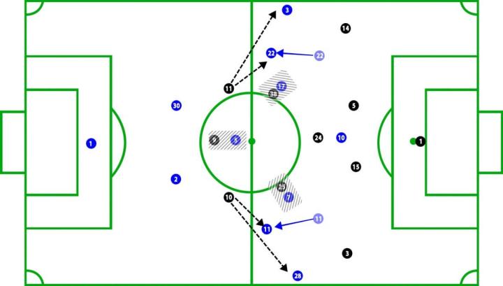 瓦尔迪的防守任务是除了压制两个中后卫以外,还有利用身体的覆盖若日尼奥的接球路线,而坎特和科瓦契奇则被恩迪迪和乔杜里紧紧盯防,边锋麦迪逊和奥尔布莱顿在身后提供额外的保护,主要是堵住通往中路地区的传球通道。
