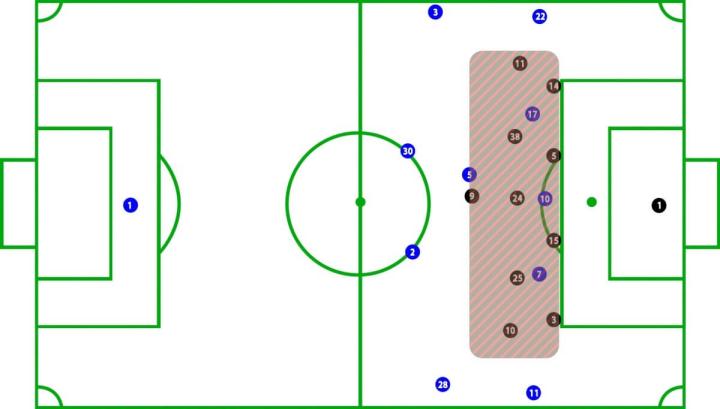 很明显,切尔西很难突破这一低位防守,他们无法有效利用防守区块里的球员,例如坎特和科瓦契奇,因此,他们常常不得不回撤到更深的位置接球,切尔西唯一一次成功将球传给禁区内的阿扎尔也是由于个人的失误,这种情况最终到了一次危险的射门,一脚爆射击中横梁,这是切尔西上半场最有威胁的一次机会。