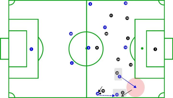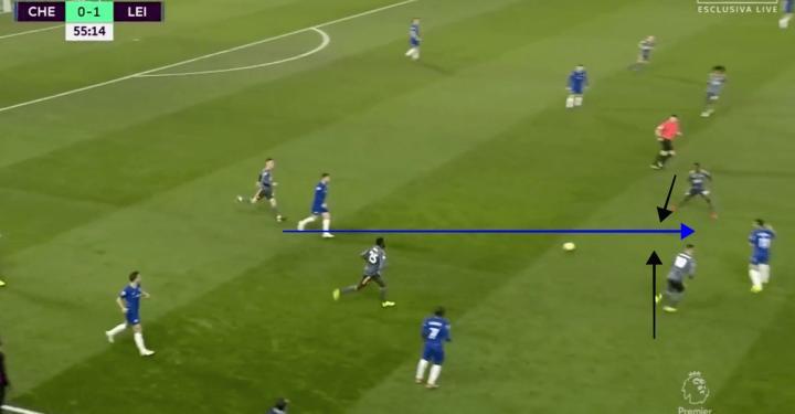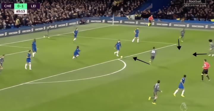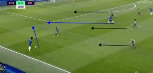 通常,突破低位5-4-1/-4-5-1阵型的方法之一就是边后卫插上形成人数优势,这是切尔西试图在边路运用的另一种模式,然而,莱斯特城的防守方式就是限制切尔西这一计划,他们额外的保护很容易就转移到球侧,创造一个人数均等的情况。