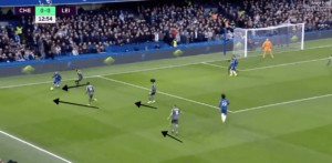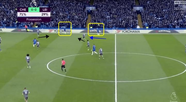 注意看下图,切尔西的边锋和边后卫立刻受到了压迫。