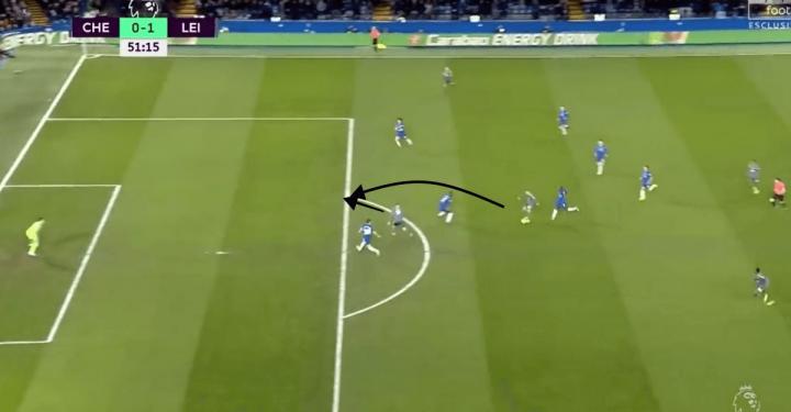 下图是切尔西在左路做这种配合,科瓦契奇在空位上得到了一次传球,但是科瓦契奇的移动路线太长了,所以,当他接到球的时候,莱斯特城的后卫很容易就跟踪了他的跑动,让他掉入了一个压迫陷阱,这意味着科瓦契奇的这次跑动几乎无法获得任何利益。