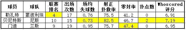 关于门将,阿雷奥拉本赛季的发挥有目共睹,但是由于联赛只出场9次,便未予选择。在3位表现最好门将中,原本我想选择球蒙彼利埃的勒孔特——全队17场仅丢13球,只比榜首的大巴黎多失3球!但当我仔细分析尼斯的贝尼特斯数据后,还是犹豫了。