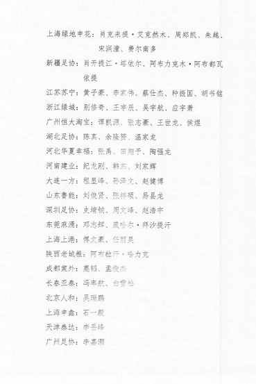 在本次名单中,共有56人入选,上海绿地申花和江苏苏宁各有5人入选,浙江绿城和广州恒大淘宝各有4人入选。中国国青队主力边锋陶强龙、莫斯科中央陆军梯队球员黎腾龙也入选了本次名单。具体名单如下: