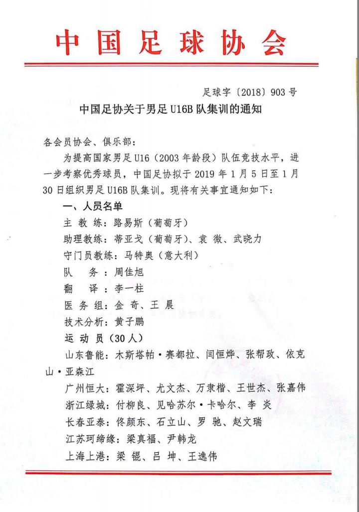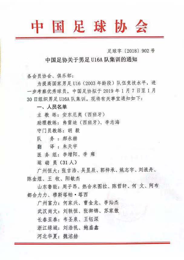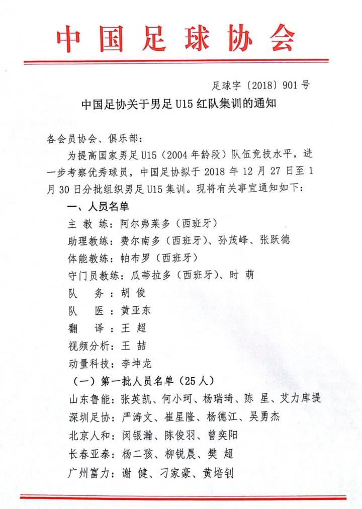 为备战2019年亚青赛预选赛,提高U18男足(2001年龄段)国家红队水平,中国足协拟于2019年1月7日至1月31日进行第一期集训。