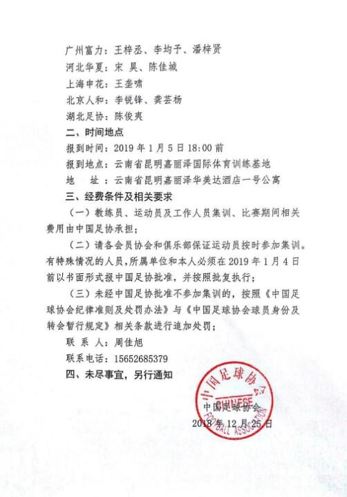 为提高中国男足U16B队(2003年龄段)队伍竞技水平,进一步考察优秀队员,中国足协拟于2019年1月5日至1月30日在云南昆明嘉丽泽组织集训。