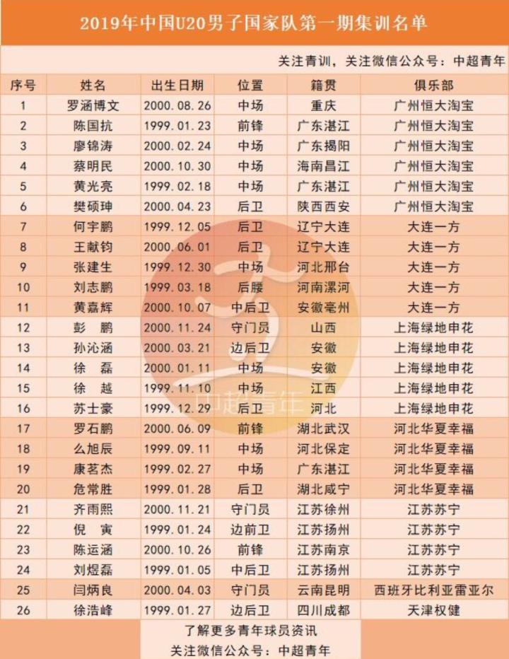 一、U20国家队集训名单:恒大6人,扬科维奇带队。