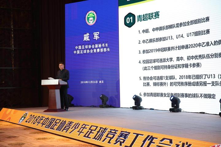 12月26日,2018年中国足球协会青少年足球竞赛工作会议在武汉举行。会上,中国足球协会副秘书长、中国足球协会竞赛部部长戚军先生发表了全年竞赛情况总结以及2019年竞赛计划。最后,大会进行了2018全国青少年足球超级联赛年度颁奖典礼。
