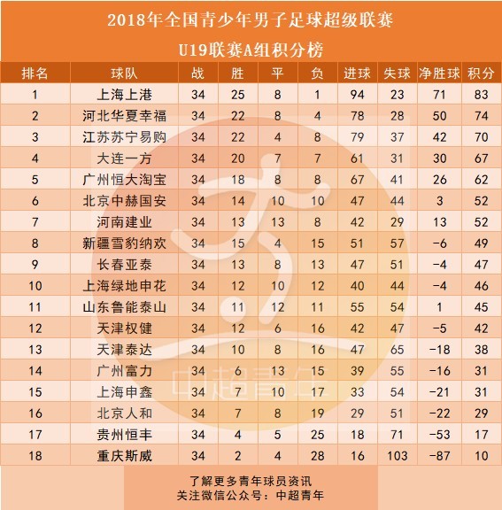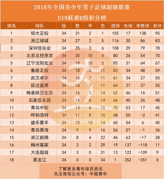 附2018年U19青超联赛A组和B组积分榜:(贵州恒丰和重庆斯威降级,恒大足校和浙江绿城升级)
