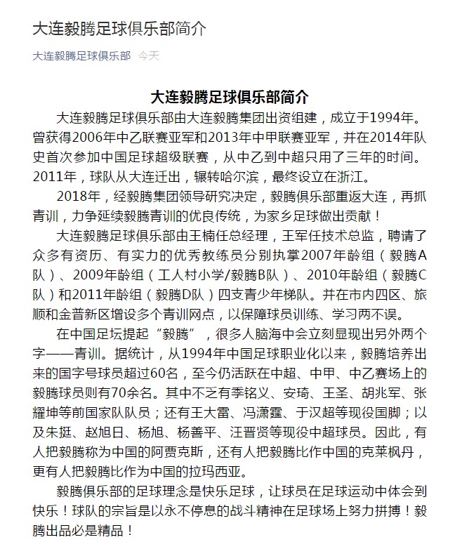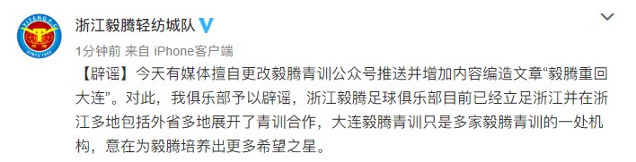 毅腾官微随后也进行辟谣:“今天有媒体擅自更改毅腾青训公众号推送并增加内容编造文章‘毅腾重回大连’。对此,我俱乐部予以辟谣,浙江毅腾足球俱乐部目前已经立足浙江并在浙江多地包括外省多地展开了青训合作,大连毅腾青训只是多家毅腾青训的一处机构,意在为毅腾培养出更多希望之星。”