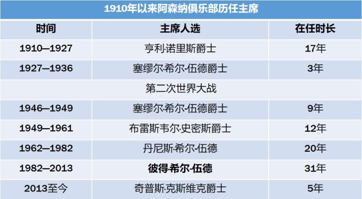 从祖父塞缪尔到父亲丹尼斯,再到彼得本人,希尔-伍德家族主政枪手的历史长达80余年。在此期间,阿森纳始终是顶级联赛球队、从未降级,并且大部分时间都占据着豪强地位,这一点在英格兰甚至是全欧洲都是难得一见的稳定。更难能可贵的是,在希尔-伍德家族的观念里阿森纳不是一种财产,他们只想好好引导并保护这个俱乐部,为球队和球迷提供最好的服务。