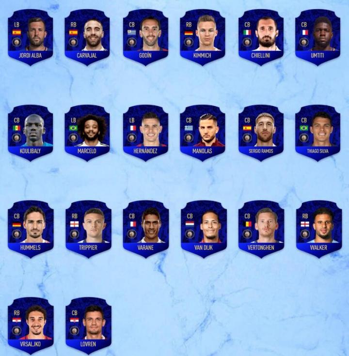 后卫:阿尔巴、卡瓦哈尔、戈丁、基米希、基耶利尼、乌姆蒂蒂、库利巴利、马塞洛、卢卡斯-埃尔南德斯、马诺拉斯、塞尔吉奥-拉莫斯、蒂亚戈-席尔瓦、胡梅尔斯、特里皮尔、瓦拉内、范戴克、维尔通亨、凯尔-沃克、弗尔萨利科、洛夫伦