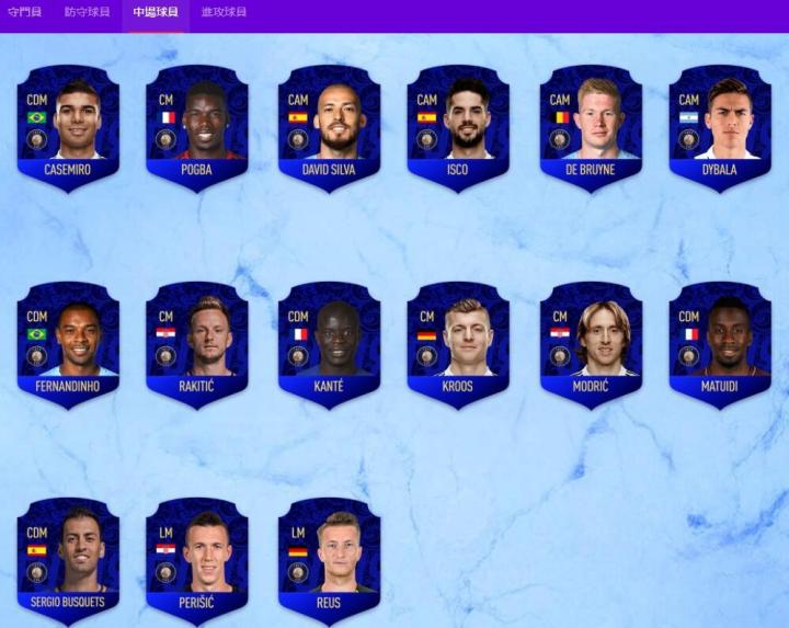 中场:卡塞米罗、博格巴、大卫-席尔瓦、伊斯科、德布劳内、迪巴拉、费尔南迪尼奥、拉基蒂奇、坎特、克罗斯、莫德里奇、马图伊迪、布斯克茨、佩里西奇、罗伊斯