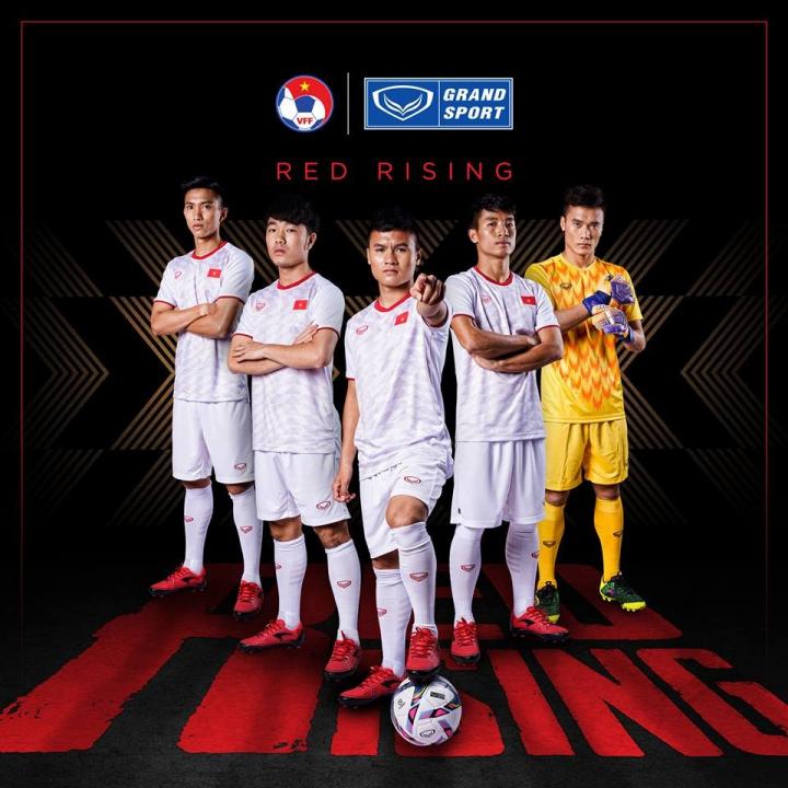 越南国家队全新主场球衣依旧延续球队一袭红衣的传统,衣领与袖口均采用金色设计,从视觉上构成越南国旗的形象。球衣正面加入动感十足的深红色箭头花纹,打造出更具活力与速度感的形象。球衣肩部还加入源自越南国旗的五角星形激光透气孔,球衣胸前Grand Sport标识与越南国旗均采用立体热压工艺打造。
