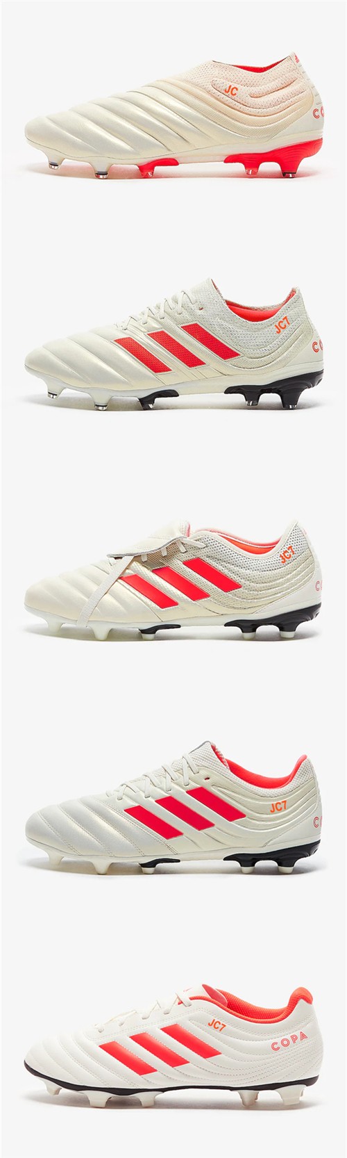 从次高端产品开始,鞋面用料和结构设计会逐渐出现档次下调,比如袋鼠皮更换为牛皮、Primeknit织物变成普通织物。此外球鞋细节上的用料也会体现出档次的降级。当然,阿迪达斯也会在次高端产品上增加一些新意,比如原本属于Copa 19.2的鞋款就被带着翻折鞋舌的Copa Gloro取代。