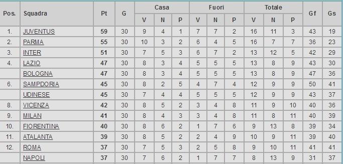 升上甲级的第一个赛季,博洛尼亚和这个赛季的维琴察成为最大黑马,两队的四场直接pk也颇为精彩。此外博洛尼亚双杀拉齐奥和桑普多利亚;一胜一平压制国米和罗马。30轮的时候还排名第五,种种精彩表现也令人印象深刻。博洛尼亚用这样一种强势的表现向世人宣告了自己的回归。而接下来的97-98赛季,则成为博洛尼亚自1964年夺冠以来最令人关注的一个赛季,那是为什么呢?