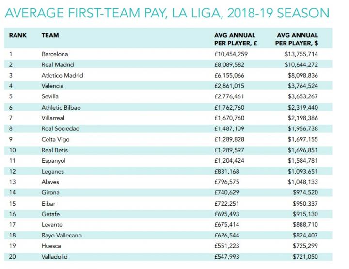 虽然我们无法通过官方渠道得到马竞本赛季的工资支出详情,但也可以利用Sports Intelligence的《全球职业体育薪资报告》找出一点线索:2018-19赛季,马竞一线队(含主帅和助教)的平均税前年薪为615.5万英镑,在西甲排名第三,比第四名瓦伦西亚的两倍还多。与欧洲足坛横向对比,马竞的平均薪水排在巴萨、皇马、尤文、曼联、拜仁之后的第6位,略微领先于大巴黎和曼城。