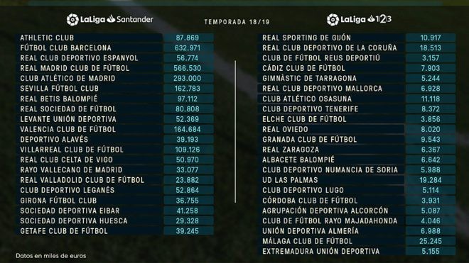 在西甲联盟公布的2018-19赛季工资帽里,巴萨以6.33亿欧元高居榜首,皇马以5.67亿欧元紧随其后,马竞以2.93亿欧元位列第三。当然,这第三和前两名的差距那是相当的明显。