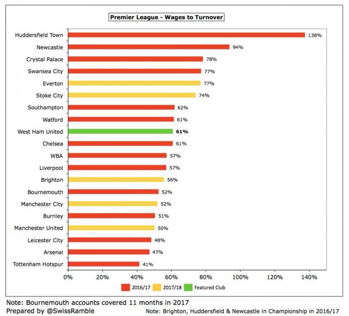 (图)英超球队工资/收入占比统计