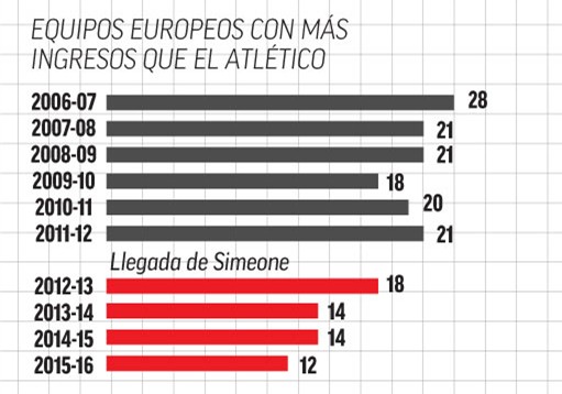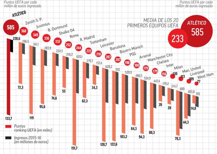 更可贵的是,接下来的几年里,西蒙尼的球队继续在西甲和欧战扮演着“挑战豪强的硬骨头”这一角色,依然取得了十分让人钦佩的成功。西媒曾经在2016年拿俱乐部的欧战积分除以收入,算出了一个欧洲俱乐部的“性价比排行榜”,马竞以超级巨大的绝对优势独领风骚。这个排行榜从统计学角度来说其实意义不大(除数应该用支出),但马竞在性价比方面的出色表现是毋庸置疑的。