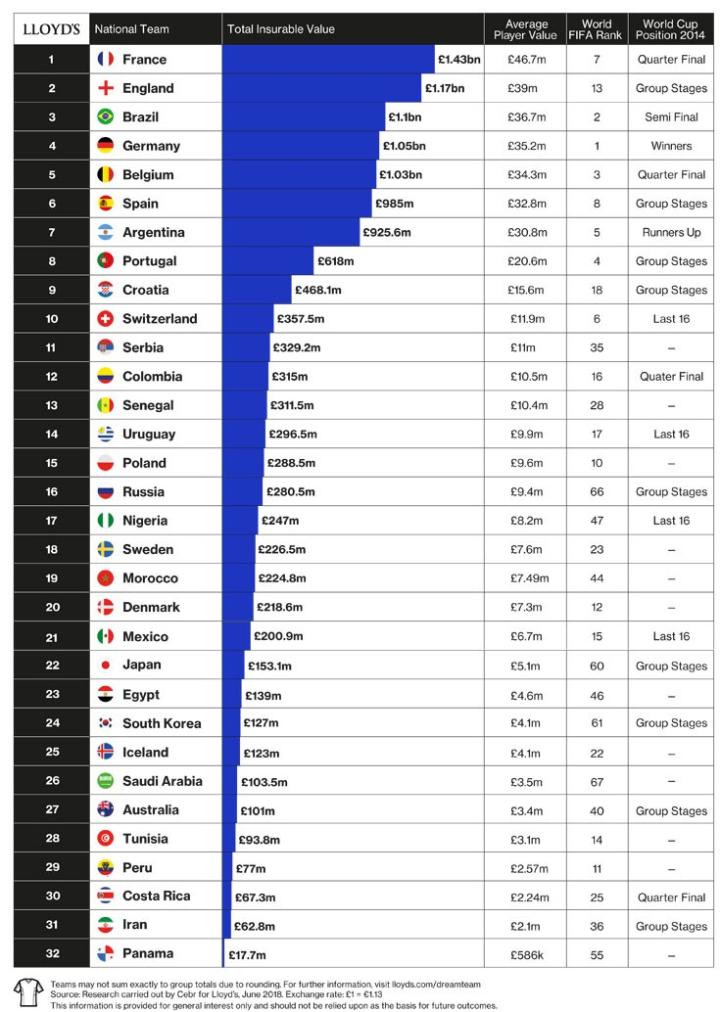 更何况,世界足坛真的已经成为了商业足球的天下。就拿看起来似乎和金元联系最远的国家队来举个例子,2018年世界杯之前著名运动调查机构Sports Intelligence和Lloyds 集团以所有球员的收入为基准,算出了32强可保价值的排行榜,再根据分组情况推演了他们能取得的成绩。你猜结果怎么着?