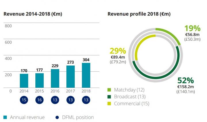 2017-18赛季,马竞的营收为3.04亿欧元,继续稳定在俱乐部收入榜的第13位。