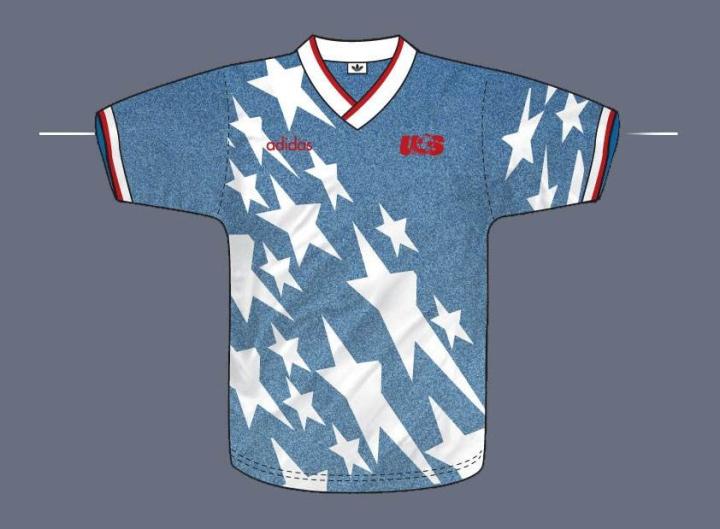 接下来的1995赛季,泰山队直接创造了一项记录——单赛季共穿过7套球衣。首先,是在对阵日后的老冤家首尔FC(那时候还叫乐喜金星)的季前热身赛上,泰山队穿了一件颇为吸引眼球的球衣。以蓝灰色为基底,点缀上白色的星星,内衬白色长袖,再搭配白色球裤和蓝色短袜,颇有些行为艺术的喜感,也怪不得被某些球迷戏称为“泰山队史上最丑球衣”。当然,这件球衣也是有模板的,完完全全就是复制了94年世界杯美国队的球衣。