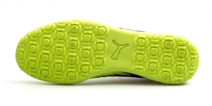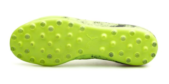 PUMA的MG大底采用了细密的圆锥形鞋钉设计,布满前后整个外底,平稳、抓地力好,完美的与国内大多数人造草球场兼容。