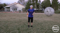 开始的时候可以先独自将球向上抛起,然后待皮球下落时用大腿将球停在脚下。