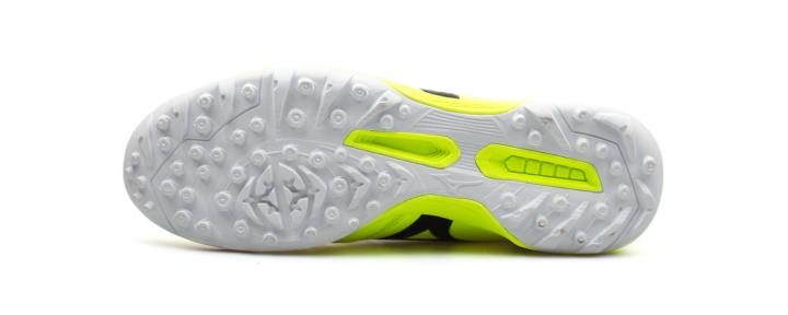 Rebula V1所使用的MD大底融合了美津浓最新的科技,大底拥有支撑技术D-Flex Groove,它的支撑作用能够让球员在高速和全力奔跑时可以有效改变身体动作而变向。同时,这款大底还拥有Stabilizer Stud(平衡鞋钉)科技,鞋钉内使用了硬度更高的材质,球员在急停急转、立足发力时,这几颗鞋钉将会为球员带来更佳的稳定性,其形变比普通鞋钉降低了27%。