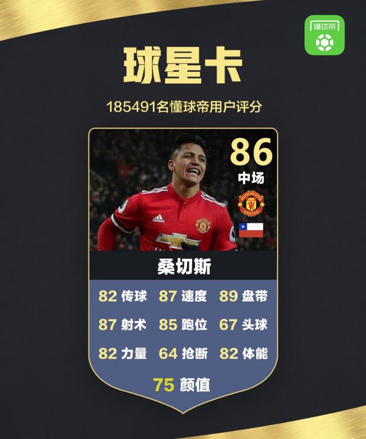 【上期回顾:球星大会第18期:“智利陆毅”桑切斯,你的评分是?】桑切斯累计评分人数超过18W人,综合得分为:86,你感觉哪项数值低了或者高了?