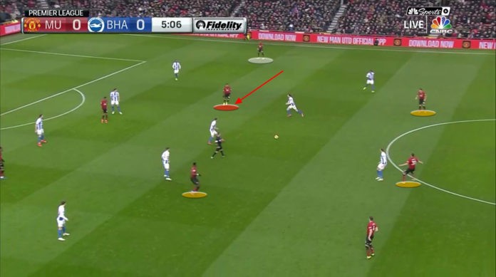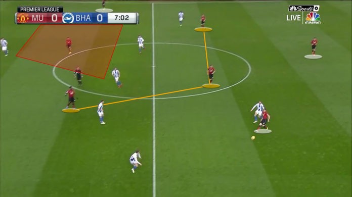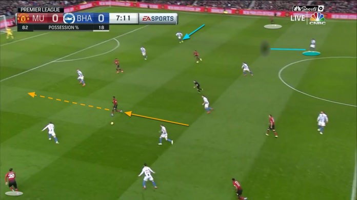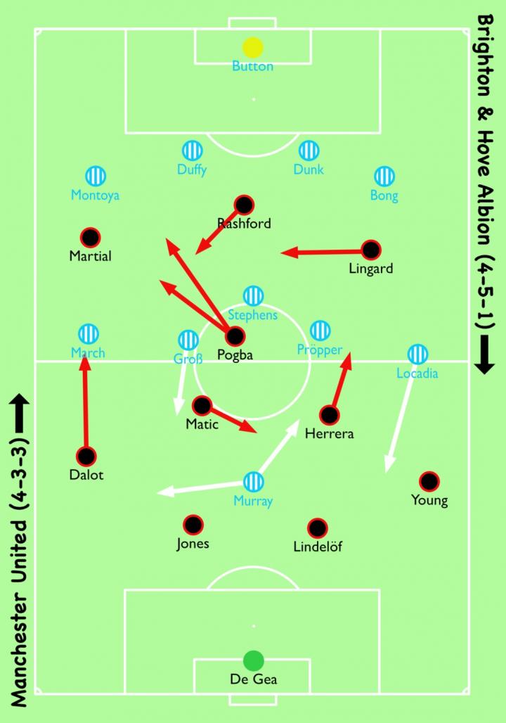 当曼联的进攻来到前场,就如我们上面说到的一样,他们将进入4-3-3阵型的位置,马蒂奇保持在中路较深的位置,博格巴和埃雷拉都处于禁区边缘的高位,期待与前场的进攻球员进行快速的传切配合并保持控球,这就让他们可以很好的利用布莱顿边后卫和中后卫之间的进攻通道。