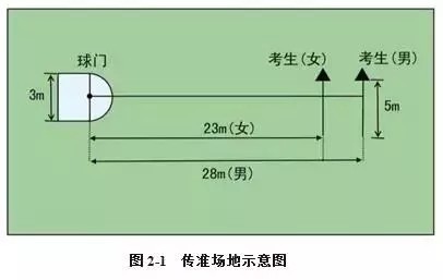 ① 考试方法:如图2-1所示,传球目标区域由一个室内五人制足球门(球门净宽度3米,净高度2米)和以球门线为直径(3米)画的半圆组成,圆心(球门线中心点)至起点线垂直距离为男子28米,女子23米。考生须将球置于起点线上或线后(线长5米,宽0.1米),向目标区域连续传球5次,左右脚均可,脚法不限。