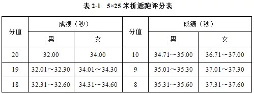 1. 考试方法:考生从起跑线向场内垂直方向快跑,在跑动中依次用手击倒位于5米、10米、15米、20米和25米各处的标志物后返回起跑线,要求每击倒一个标志物须立即返回一次,再跑到下一个标志物,以此类推。考生应以站立式起跑,脚动开表,完成所有折返距离回到起跑线时停表,记录完成的时间。未击倒标志物,成绩无效。每人测试1次。