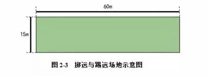 ① 考试方法:如图2-3所示,在球场适当位置画一条15米线段作为测试区横宽,从横线两端分别向场内垂直画两条60米以上平行直线作为测试区纵长,标出距离数。考生站在起点线后,先将球以手掷远3次(允许带手套进行),然后用脚踢远3次(采用踢凌空球、反弹球、定位球等方法不限),各取其中最好一次成绩相加为最终成绩。每次掷、踢球的落点必须在测试区横宽以内,否则不计成绩。