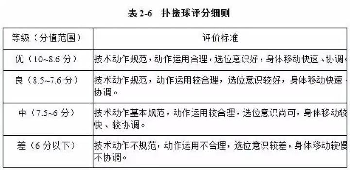 ② 评分标准:考评员参照扑接球评分细则(表2-6),独立对考生进行技术技能评定。采用10分制评分,分数至多可到小数点后1位。