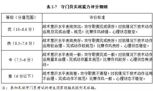 ① 考试方法:考生守门,扑接10个来自罚球区线外射中球门的有效射门球(含地滚球、半高球、高球以及需要倒地扑救的球)。