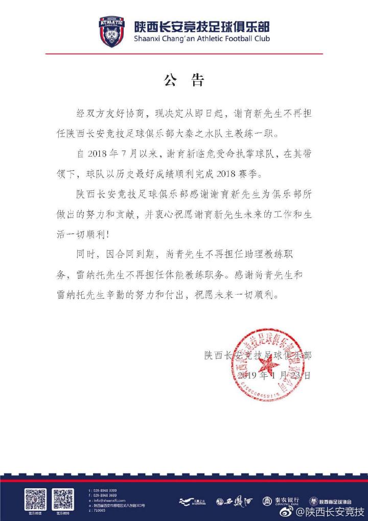 【官宣】谢育新先生不再担任陕西大秦之水队主教练一...宇任拓2019-01-23 14:59【官宣】谢育新先生不再担任陕西大秦之水队主教练一职,尚青先生不再担任助理教练职务,雷纳托先生不再担任体能教练职务。展开更多