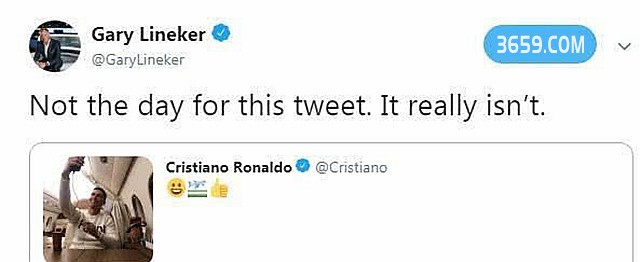 可就是这么一张没有犯法也没有惹事的照片,却让他被推到风口浪尖上。英格兰名宿现在著名的足球评论员兼主持人莱因克尔转发了C罗的动态后,直接给予怒批,他说这个动态在今天发一点儿也不合适。虽然莱因克尔的话很短,但可以看到他非常愤怒。莱因克尔为什么这么说?因为最近世界足坛发生了一件不好的事,卡迪夫城的新援萨拉乘坐的飞机不幸迷航,到现在都杳无音信,他的生死至今还是一个未知数。