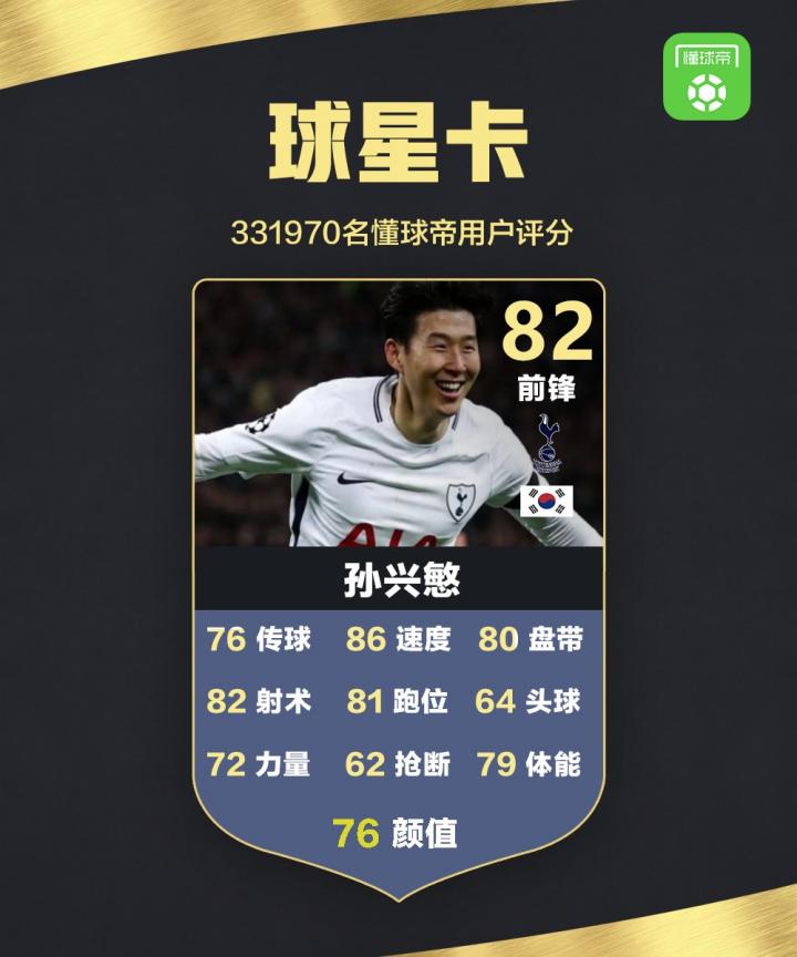 【上期回顾:球星大会第23期:“亚洲一哥”孙兴慜,你的评分是?】孙兴慜累计评分人数超过33W人,综合得分为:82,你感觉哪项数值低了或者高了?