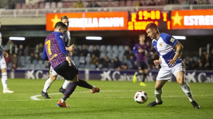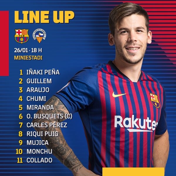 阵容:Iñaki Peña, Guillem (Morer, min 78), Araujo (Cuenca, min 85), Chumi, Miranda (Vilarrasa, min 74), O. Busquets, Carles Pérez, Riqui Puig, Mujica, Monchu y Collado