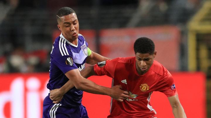(蒂勒曼斯在欧联杯上防守拉什福德)
