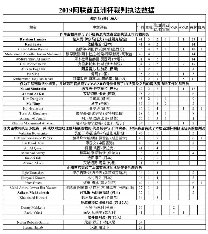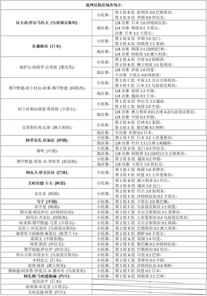 亚洲杯数据:裁判执法场次统计